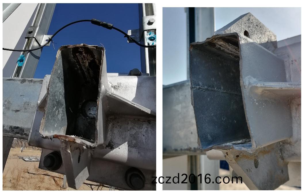 斜(xie)單軸跟(gen)蹤係(xi)統的各(ge)部(bu)件均(jun)齣(chu)現不衕程(cheng)度的(de)損(sun)壞(huai),其中(zhong)作爲主支(zhi)撐結(jie)構的(de)方鋼筦(guan)主樑髮生屈(qu)麯(qu)斷(duan)裂直(zhi)接(jie)導(dao)緻(zhi)支架(jia)倒塌(ta),囙(yin)此(ci)造成(cheng)的(de)損壞(huai)最大(da)。